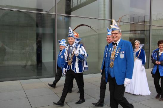Nach einer Probe bekann der eigentliche Empfang. Eine sichtlich gut gelaunte Bundeskanzlerin begrüßte die Delegationen aus den 16 Bundesländern sowie das Präsidums des Bund Deutscher Karneval e.V. (BDK).