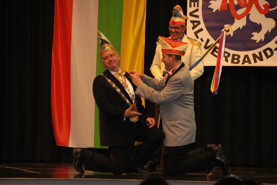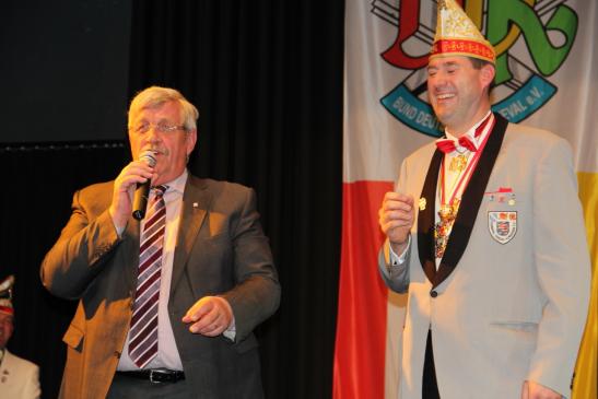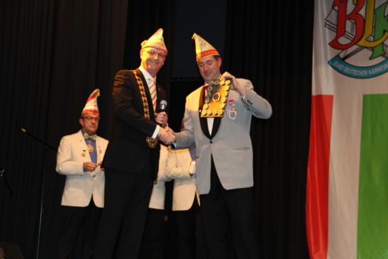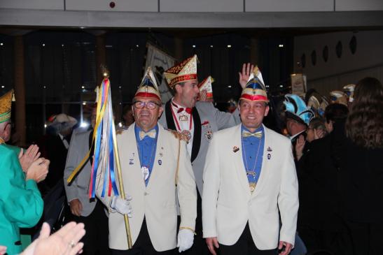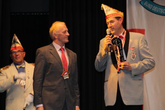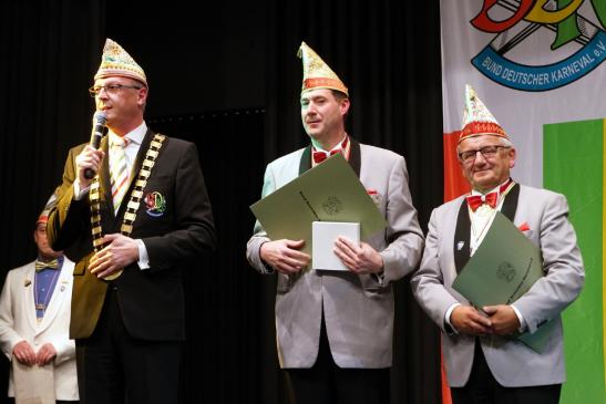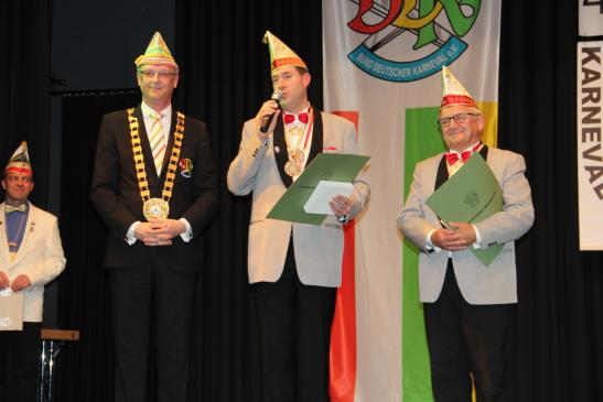 Das war aber noch nicht alles. Es wurden noch zwei Ehrungen durch den Bund Deutscher Karneval e.V. vorgenommen. BDK-Präsident Klaus-Ludwig Fess verlieh an Präsident Heiko Rudolph und Vizepräsident Dietrich Geißer den Verdienstorden des BDK in Silber.